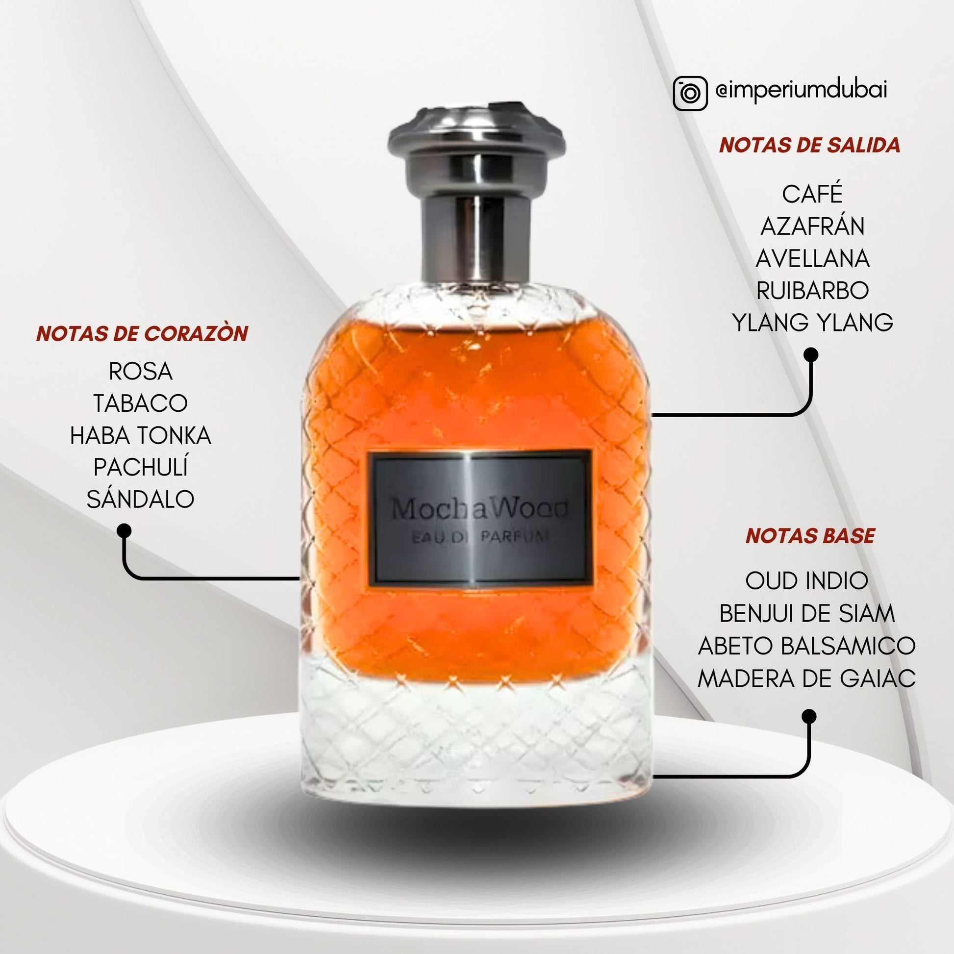 Al aplicar Mocha Wood, es como sumergirte en un café antiguo iluminado por velas: el aroma del café y la avellana envuelve los sentidos, mientras el azafrán aporta un resplandor exótico. Luego, el tabaco y la rosa emergen como un susurro elegante, aportando calidez y profundidad. A medida que evoluciona, la base amaderada y resinosa sostén la fragancia con una intensidad refinada que dura horas.